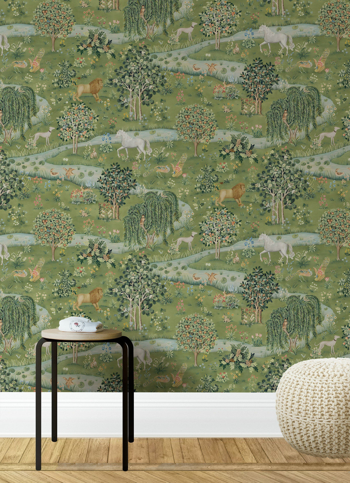 This wallpaper shows a hand-painted meadow landscape with winding streams, flowering shrubs, and willow trees. The scene includes animals such as lions, rabbits, birds, and pale horses in soft green, sage, and muted earth tones. It suits living rooms, bedrooms, and dining rooms with nature-inspired or vintage decor.