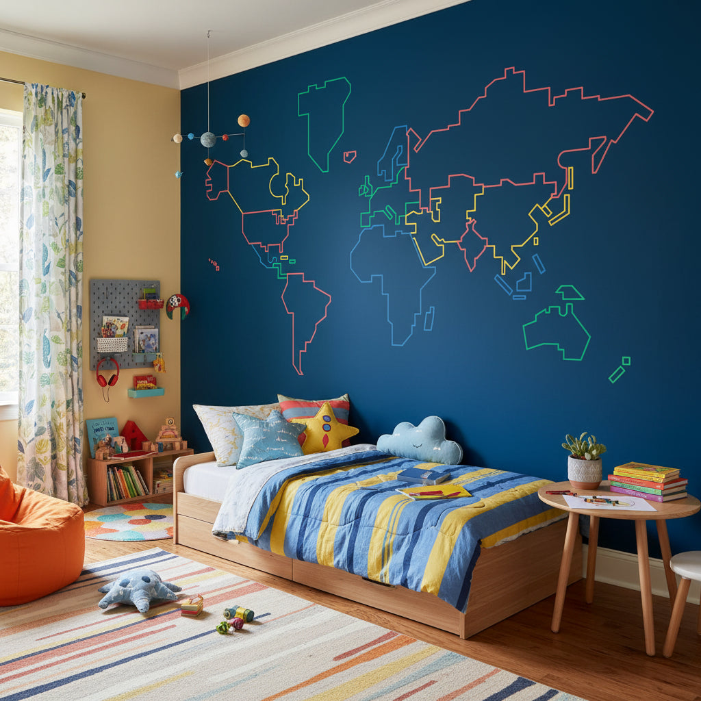 This modern wall mural shows a world map in an abstract style with bold lines. The design includes vibrant red, yellow, blue, and green colors against a dark blue background, ideal for a contemporary setting.