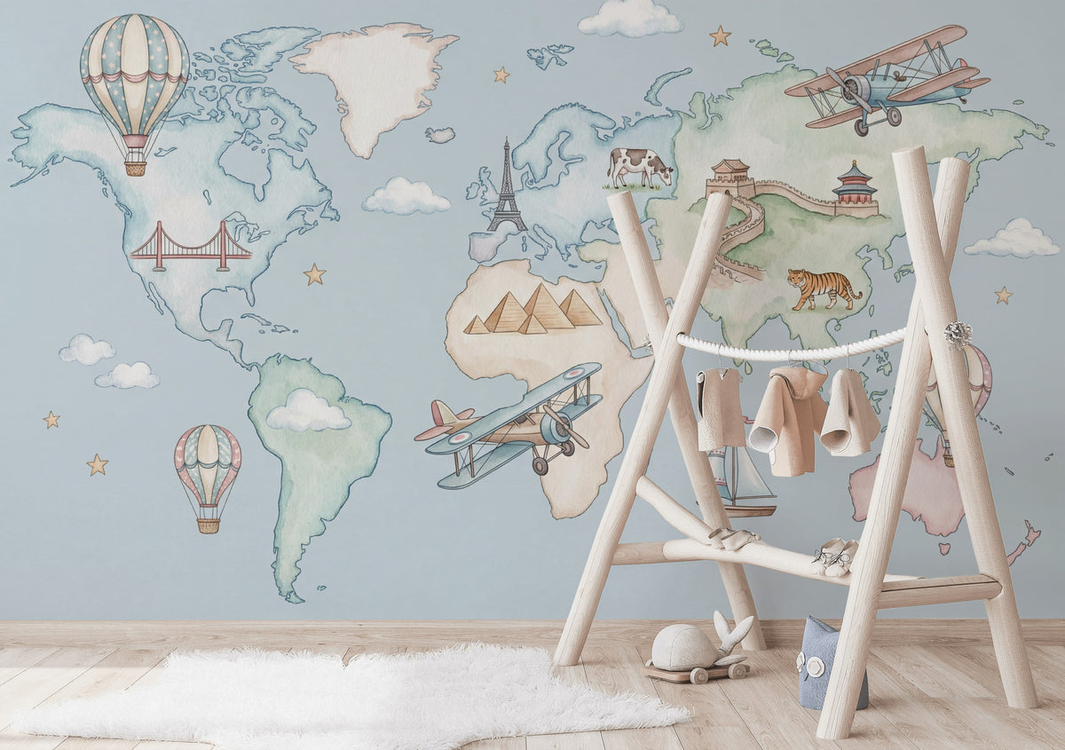 This children's mural depicts a whimsical world map with hot air balloons, airplanes, iconic buildings, and animals, set against a backdrop of clouds and stars. The design includes soft tones of light blue, beige, pink, gray, and green, making it suitable for a playful and educational space.