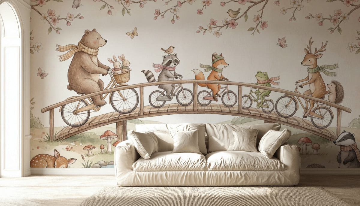 This delightful mural shows animals like bears, raccoons, and foxes riding bicycles across a bridge. The soft pastel tones and illustrative style create a whimsical scene perfect for a child's room.