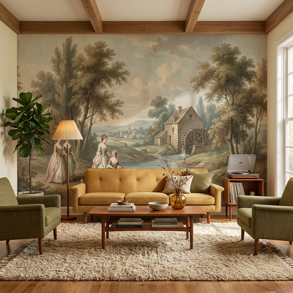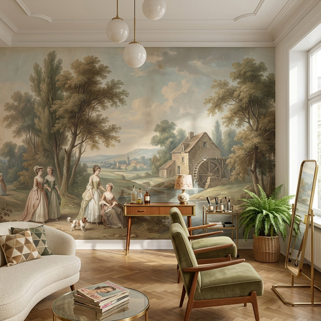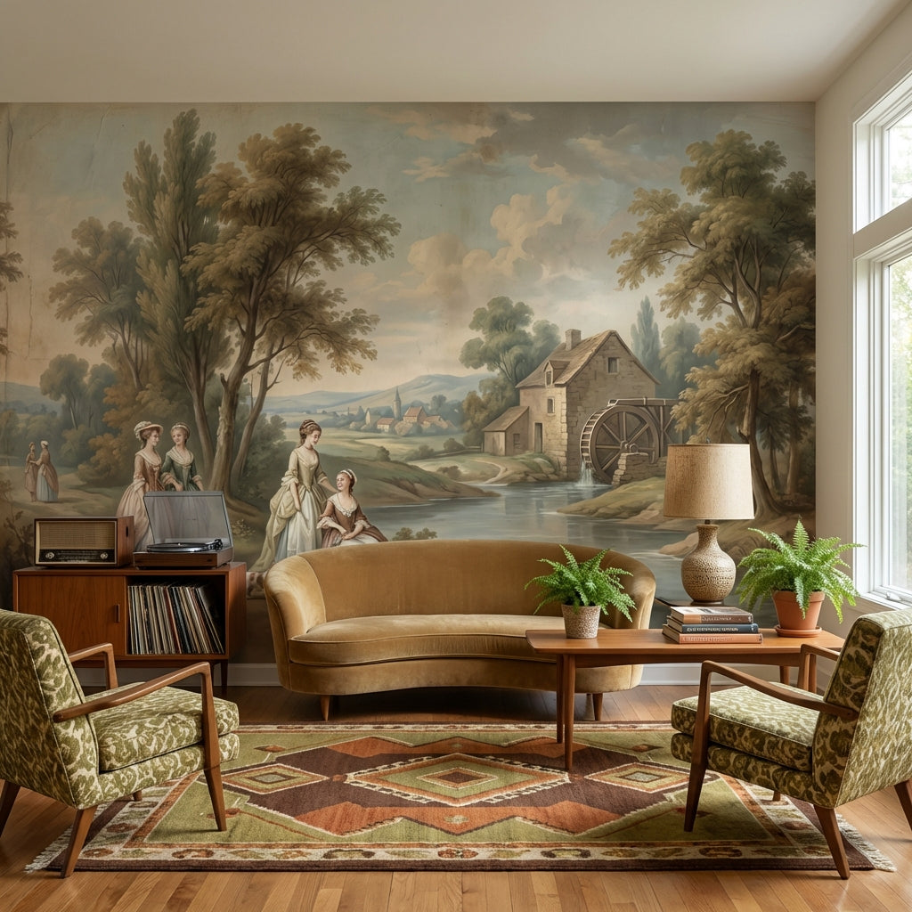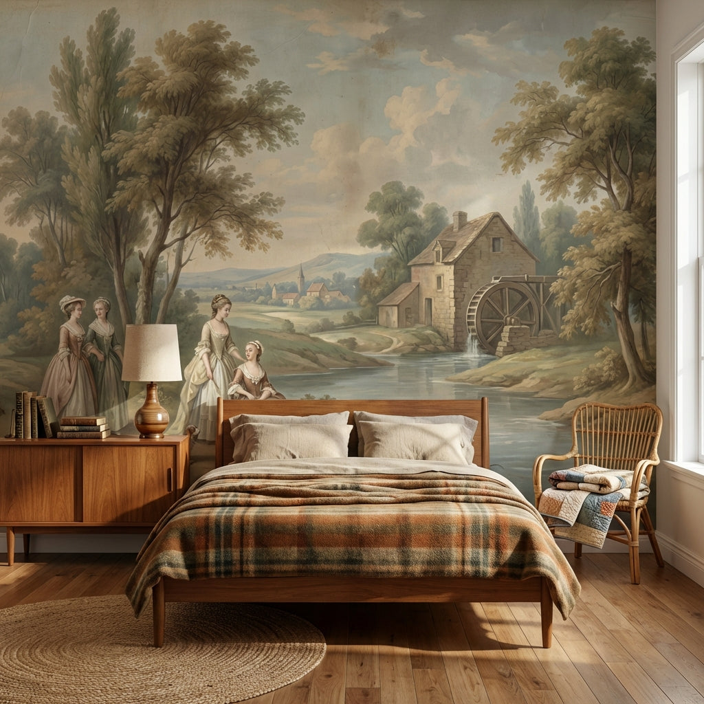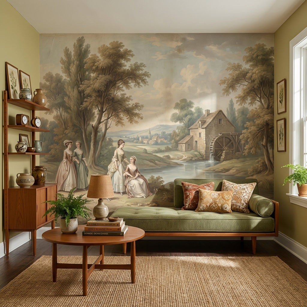 This classic mural shows serene figures and trees near a river, accented by a charming cottage and watermill. The light brown, green, blue, and beige tones add a peaceful touch.