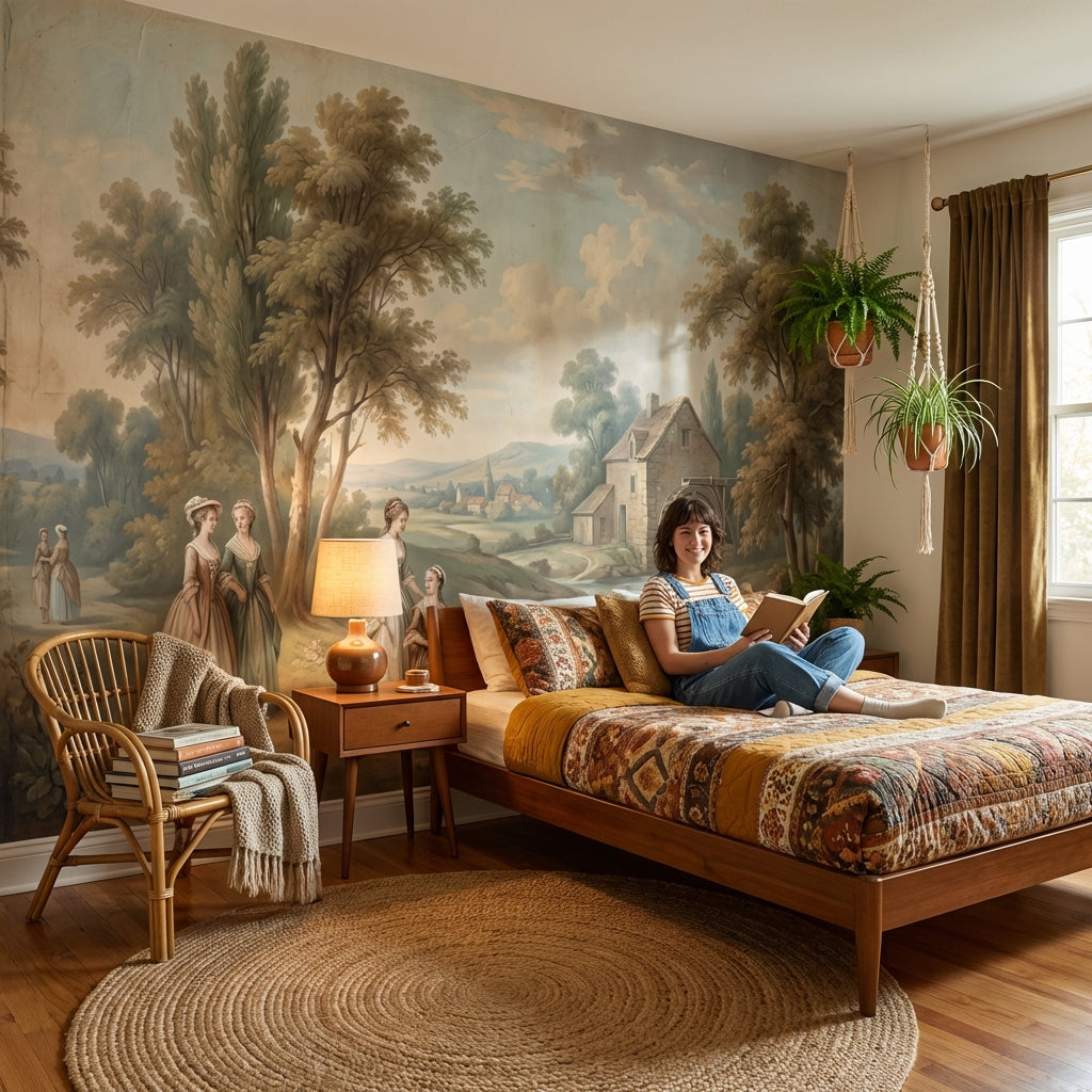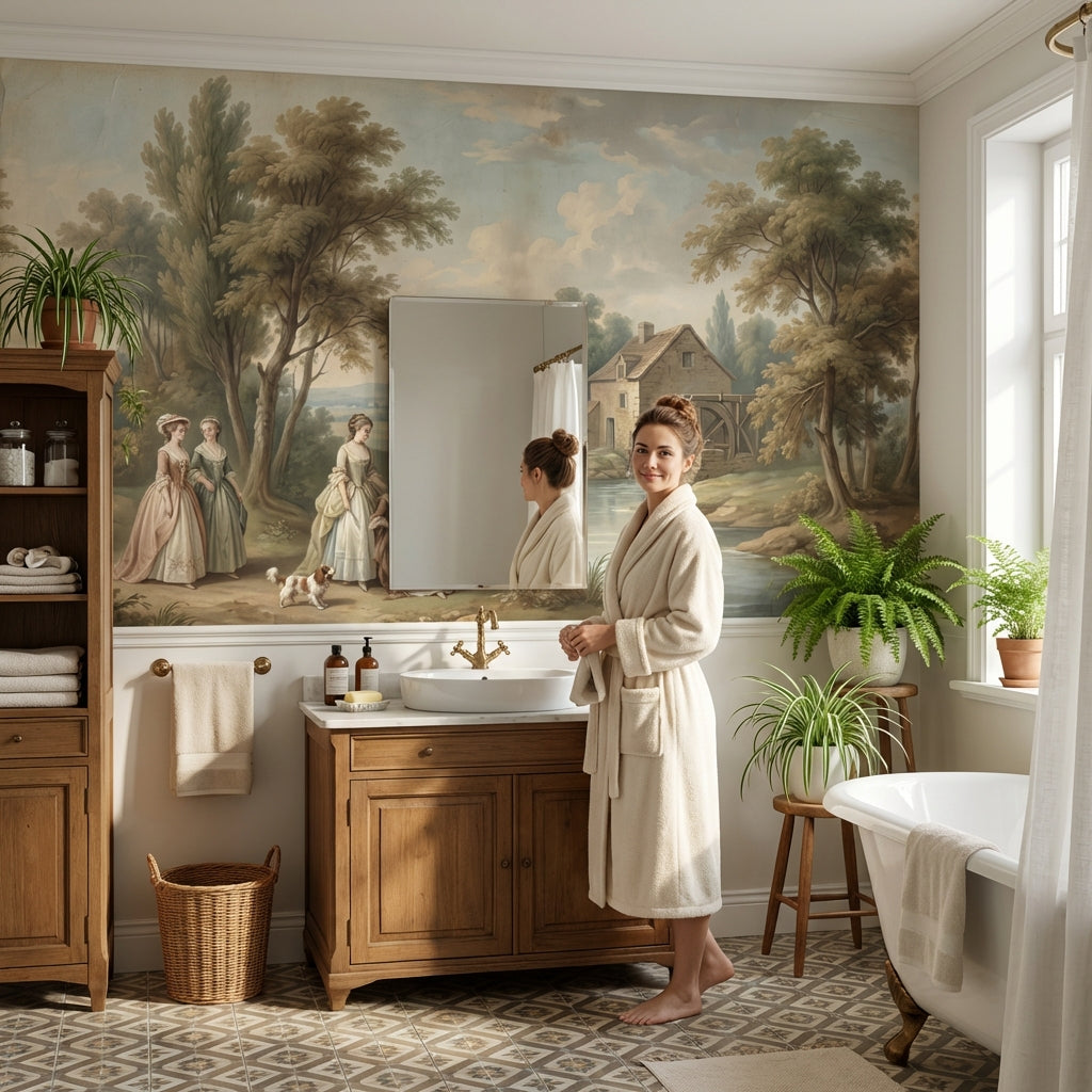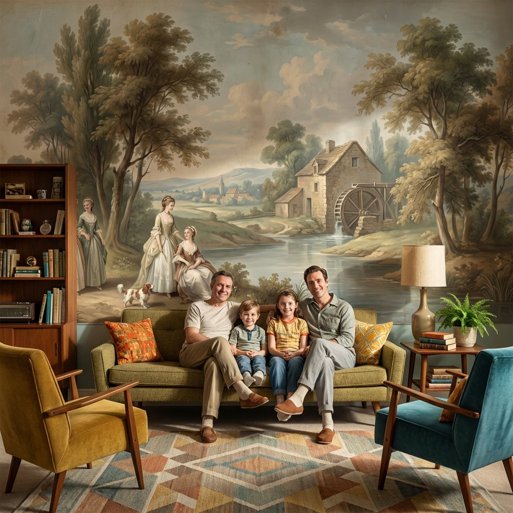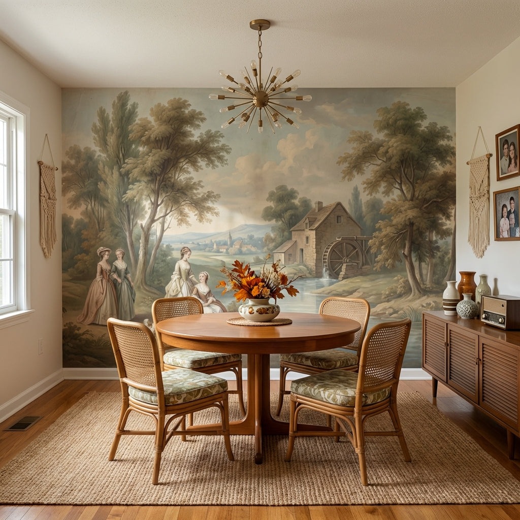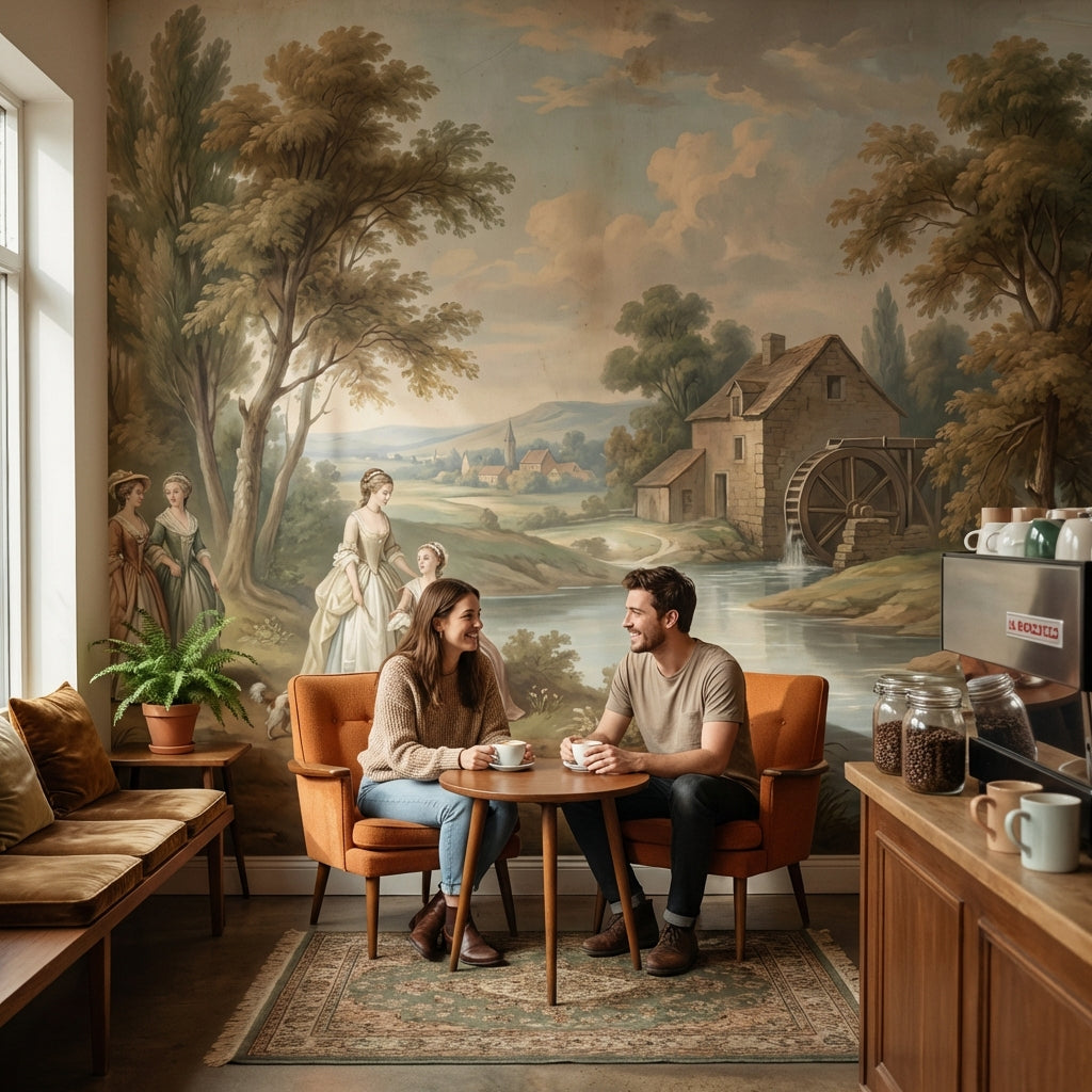 This classic mural shows serene figures and trees near a river, accented by a charming cottage and watermill. The light brown, green, blue, and beige tones add a peaceful touch.