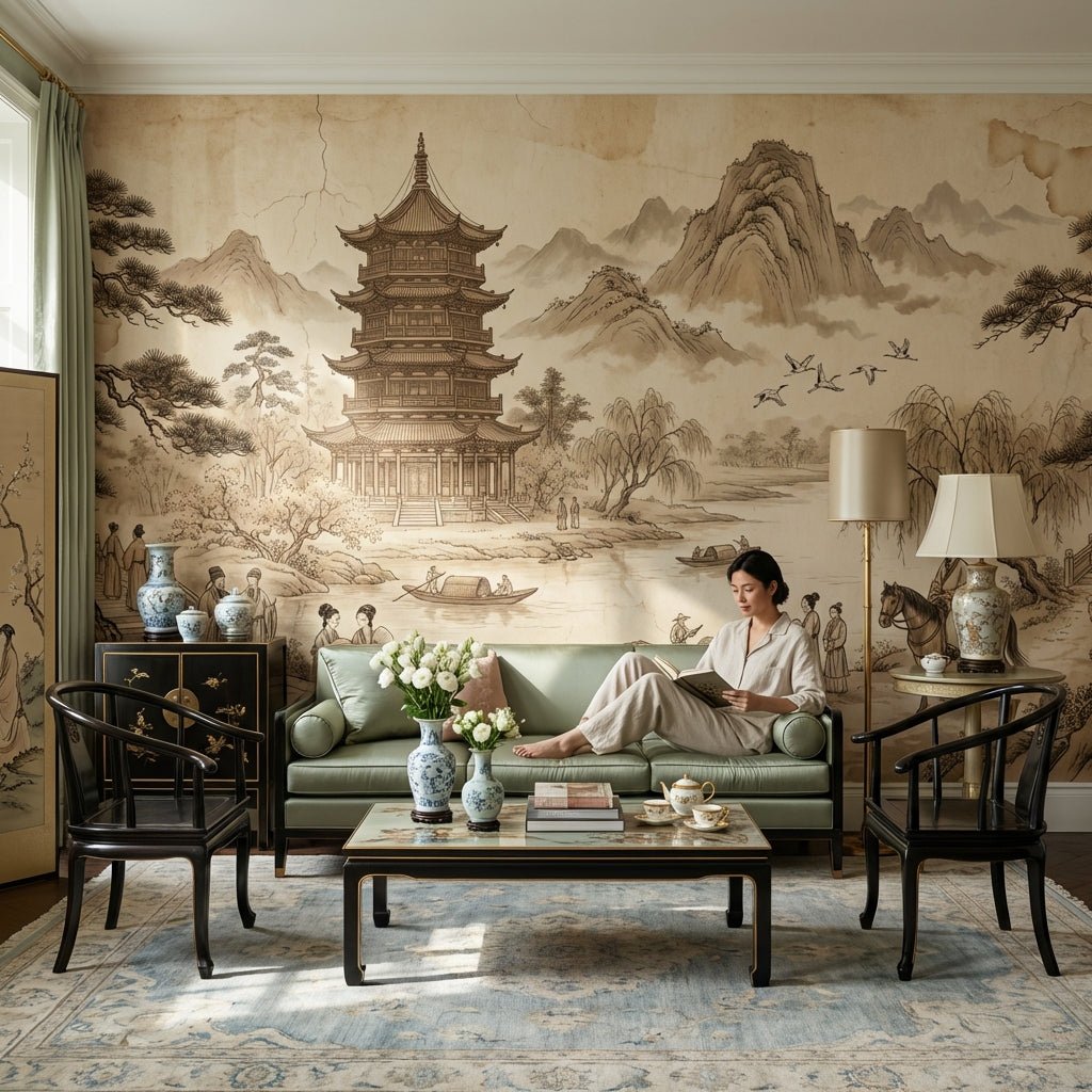 This traditional wall mural shows a serene Chinese landscape with a pagoda, mountains, and a river. The sepia tones and vintage style make it ideal for classic decor.