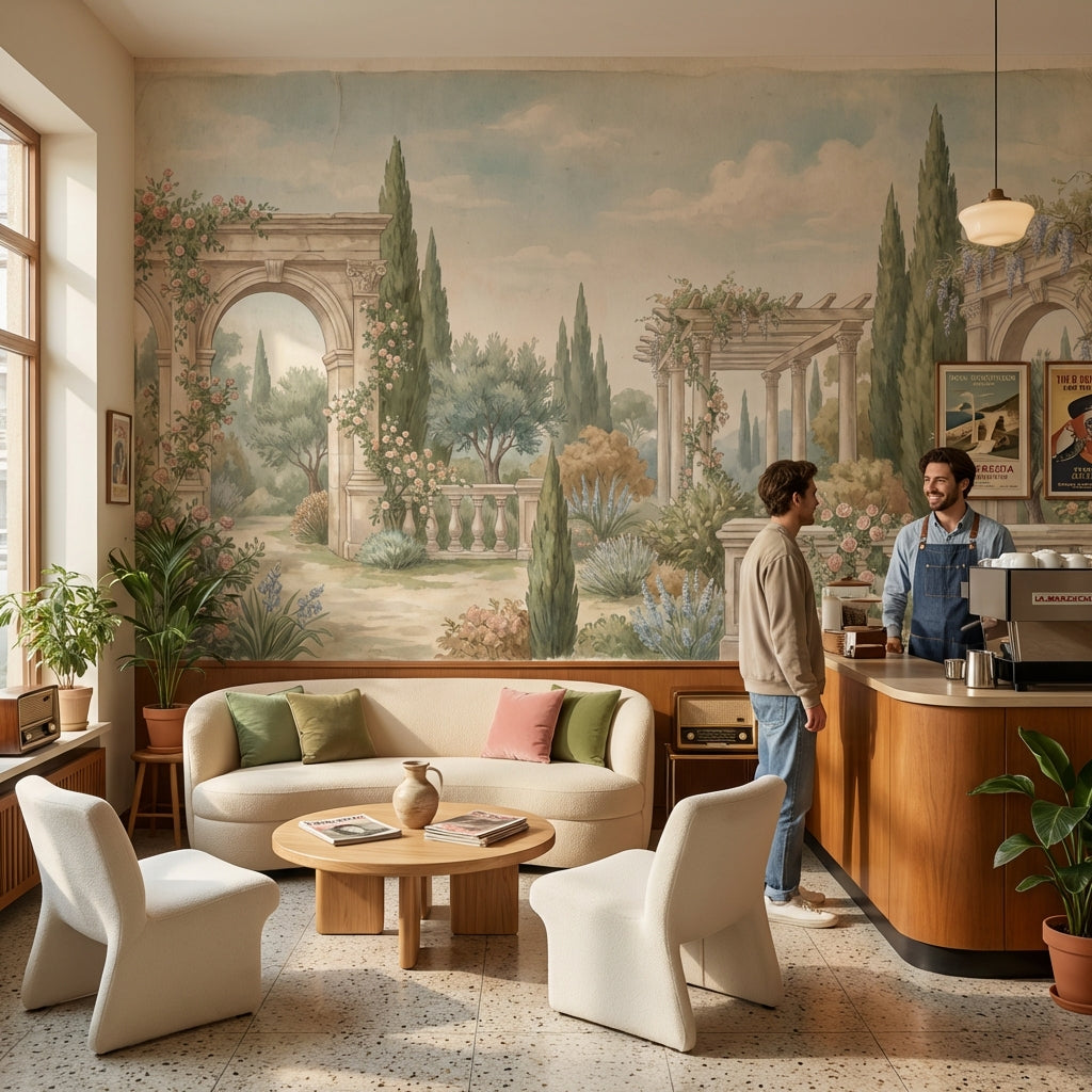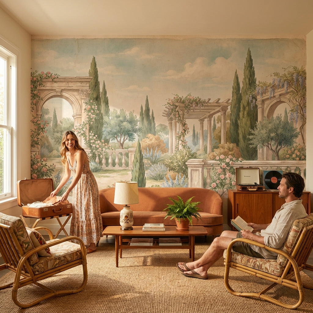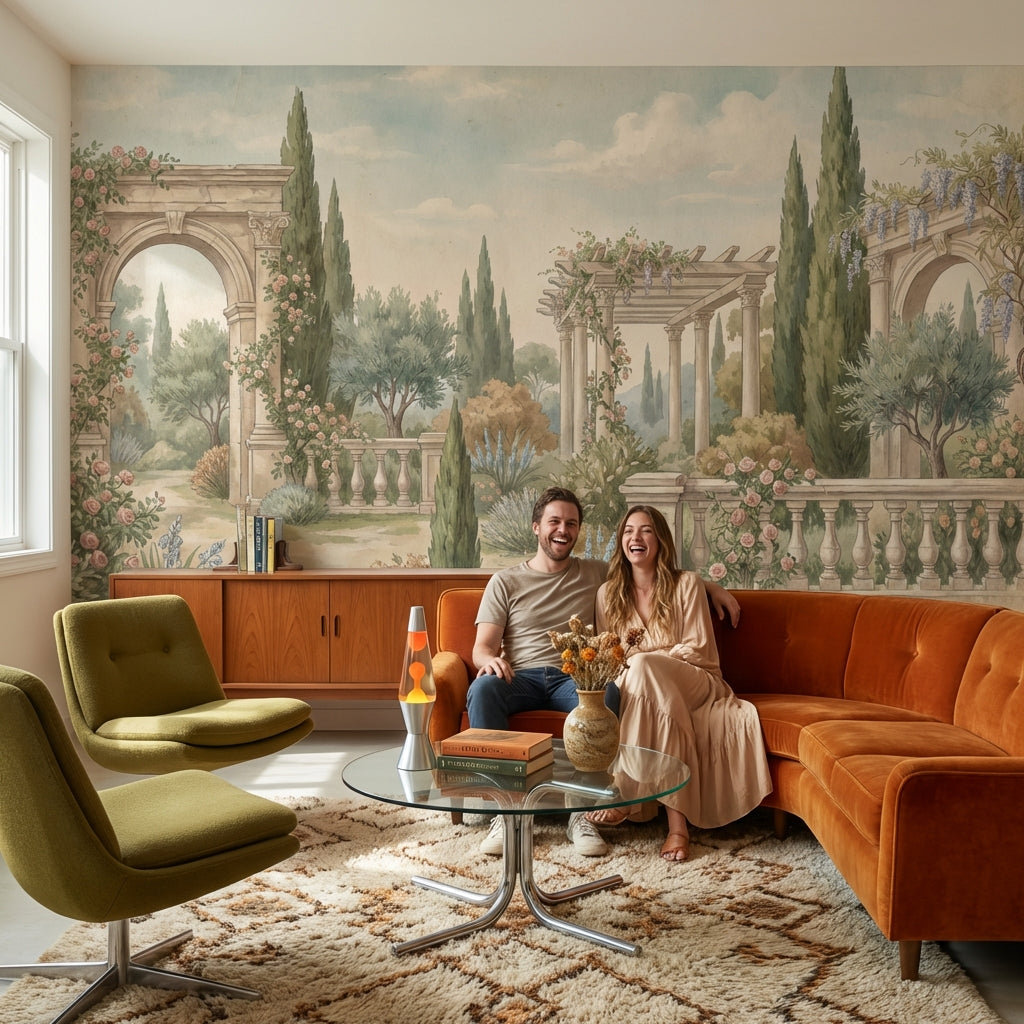 This mural includes arches, columns, and intricate vines, complemented by trees and flowers. The vintage style in shades of green, blue, beige, and pink creates a serene landscape, perfect for classical decor.