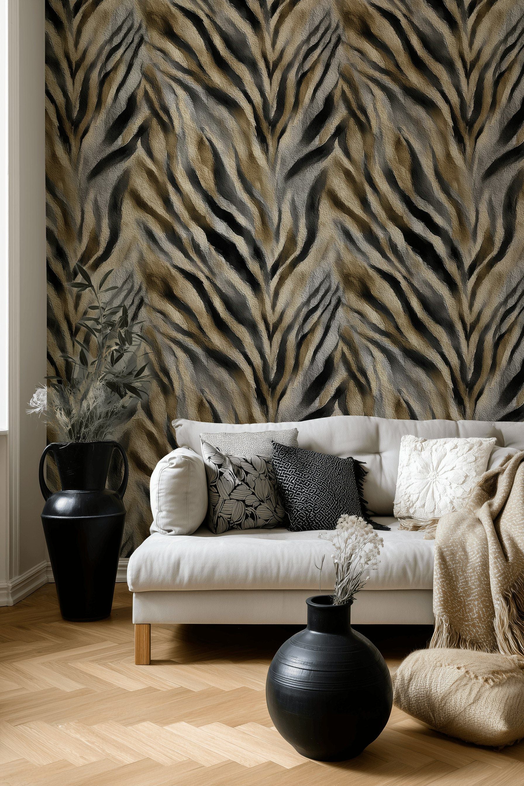 This wallpaper features a zebra-inspired animal print rendered with painterly depth in shades of beige, tan, and black. The textured look mimics layered brushstrokes, giving it a tactile, natural appearance. With its neutral tones and flowing striped design, this mural brings modern safari energy to contemporary interiors.