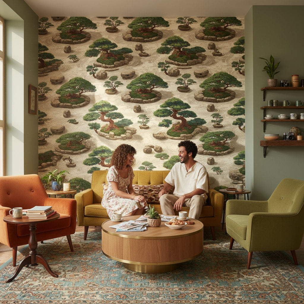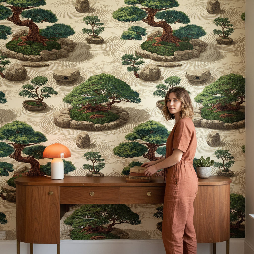 Explore tranquility with this cream-colored wallpaper featuring Japanese zen gardens adorned with lush green trees and subtle stone textures. The intricate design evokes a serene ambiance, perfect for creating a calming focal point in living rooms or home offices. This wallpaper enhances natural light while offering a balanced visual appeal, seamlessly blending with modern and Scandinavian decor. Pair it with natural wood furniture and minimalistic accents for a harmonious look.